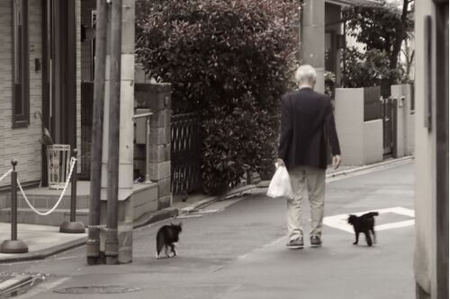 おじいちゃんにまとわりついて歩く二匹の猫さま おじいちゃんは迷惑そうだったけれど… 「猫町」にふさわしい ほんわかする 一コマ であった。。 目がくりくり 可愛らしい。。 こういう感じも 「猫町」らしい。 ===4月23日 落合から中野まで猫さま歩き…